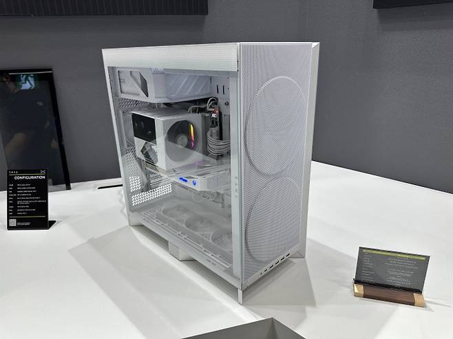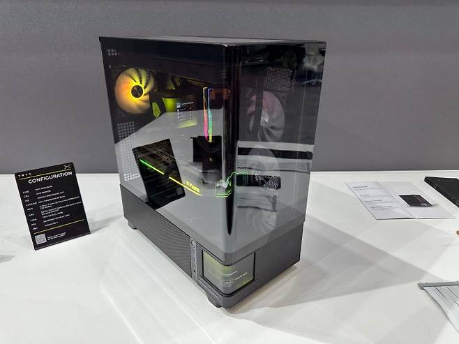 전시된 구성에서는 최신 인텔 울트라 285K CPU와 RTX 5080 그래픽카드, TRYX 수랭 쿨러가 들어가 고성능 셋업에 최적화된 내부 공간 활용을 체감할 수 있었다. 케이스 외형을 구성하는 주요 재질은 6000 시리즈 알루미늄 프레임으로 가까이에서 만져보니 견고하면서도 무광의 금속 질감이 살아 있었다.