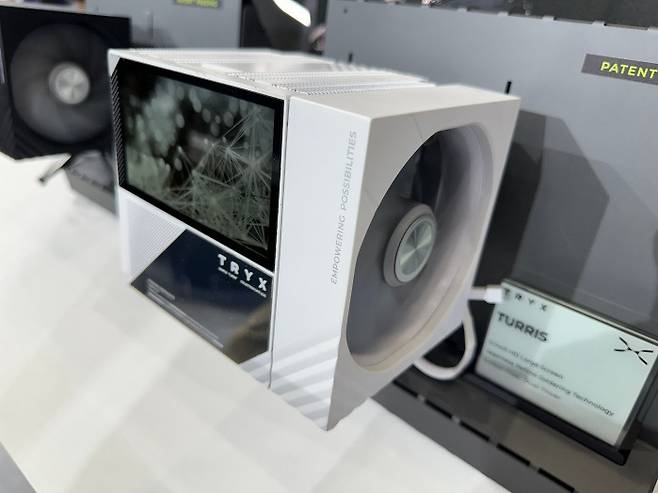 TRYX는 자사 최초의 공랭 CPU 쿨러 TURRIS를 컴퓨텍스 2025에서 선보였다. 하이엔드 듀얼타워 구조에 6개의 히트파이프, 5인치 디스플레이를 전면에 배치해 '감성 쿨링 시스템'을 완성해 준다. 듀얼 타워 히트싱크 설계를 채택해 방열 면적을 양쪽으로 넓혀 열 분산 효율을 극대화 할 수 있다.