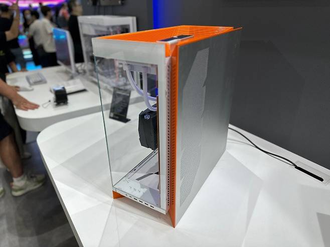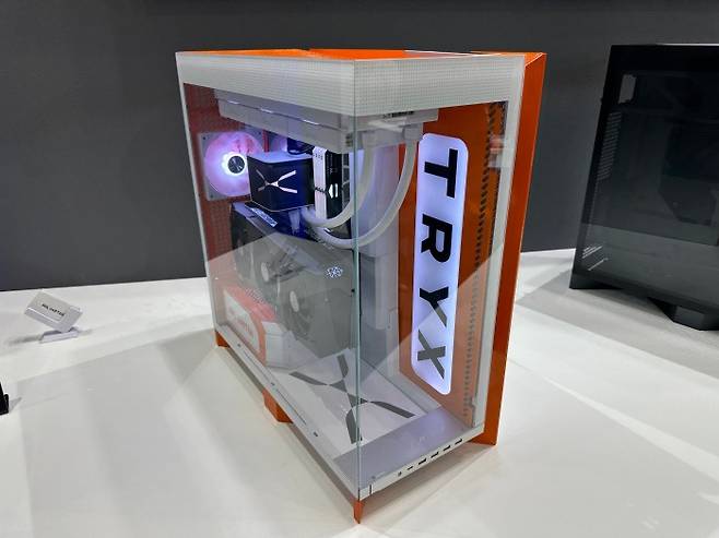 다음으로 만난 'LUCA L70' 케이스는 강화유리 패널, 스틸 소재, 원색의 주황색이 한데 뭉쳐 인테리어 오브제처럼 느껴질 만큼 세련된 조형미를 뽐냈다. 미드타워 규격의 E-ATX 케이스지만, TRYX 특유의 공간감과 여백을 잘 살린 설계 덕분에 전시 테이블 위에서도 여유롭고 고급스럽게 보였다.