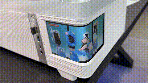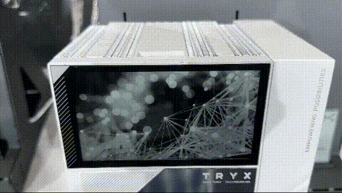 부스 취재를 도와준 TRYX 관계자의 코멘트에 따르면 TRYX 전시장에 진열된 케이스 중에서 주인공으로 뽑은 제품은 'ARCVISION'이었다. 가장 큰 특징은 전면 하단에 곡선 유리를 통해 연결된 AMOLED 디스플레이다. 온도 표시나 시스템 정보 출력에 그치지 않고 전용 소프트웨어를 통해 3D 비주얼, 화면 녹화, 영상 출력을 지원한다.