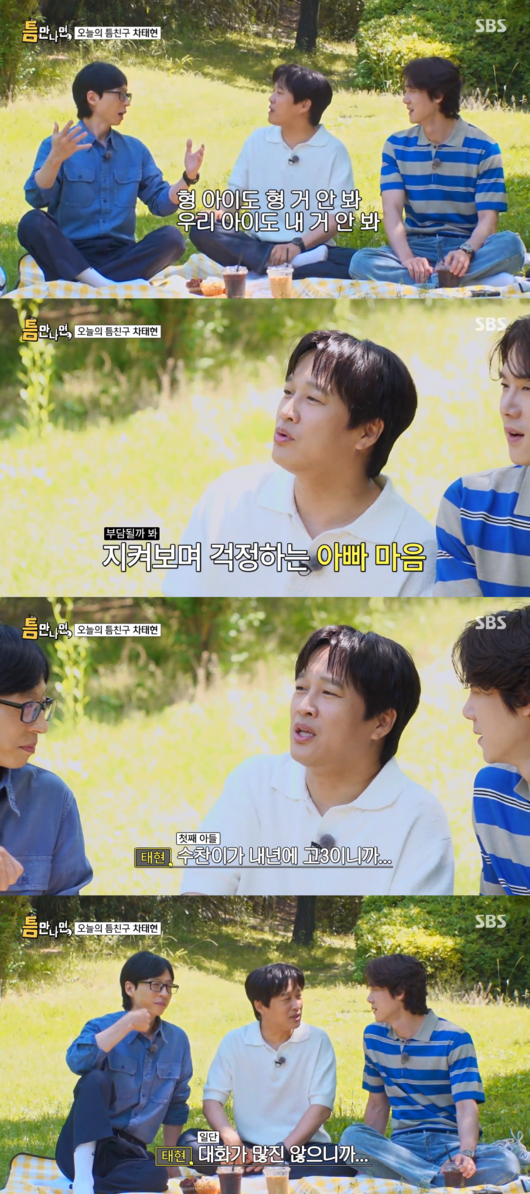 요즘 최대 고민으로 차태현은 "고민 없이 살 수 없다. 우리 첫째 아들이 내년에 고3이다"고 했고 유재석은 "같은 학부모로 두통 온다"고 공감했다.