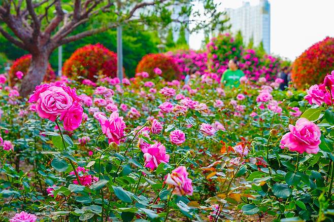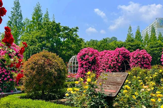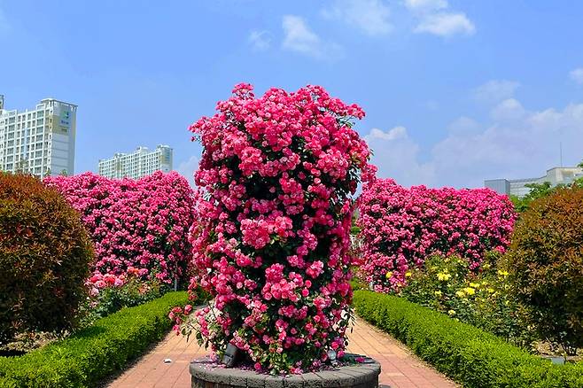 중촌공원에 들어서면 초입부터 빨간색, 분홍색, 노란색 등 다채로운 색감의 장미꽃들이 방문객을 반긴다.