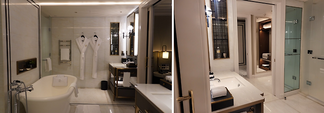 침실 벽면에 설치된 이중 슬라이딩 도어를 열면 빅토리아풍 욕조로 꾸민 욕실이 나타난다. 반투명 유리, 패턴으로 장식된 거울, 그리고 크리스털 벽 장식이 밝고 경쾌한 느낌을 더한다. 동반인과 따로 사용할 수 있는 두 개의 세면대와 별도로 구분한 화장실과 샤워시설 등에서는 편안한 휴식을 위해 신경 썼음을 느낄 수 있다.