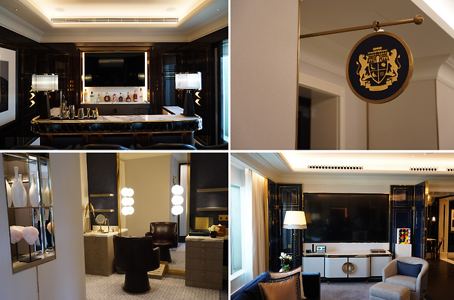 스위트룸에 들어서면 마치 화랑과 같이 꾸민 현관이 투숙객을 맞이한다. 거실을 압도하는 무채색의 인테리어와 대리석 협탁은 영국의 귀족적인 분위기를 한층 더 강조한다. 우아한 가구들과 생동감 넘치는 그림과 사진이 고풍스러우면서 현대적인 느낌을 준다.