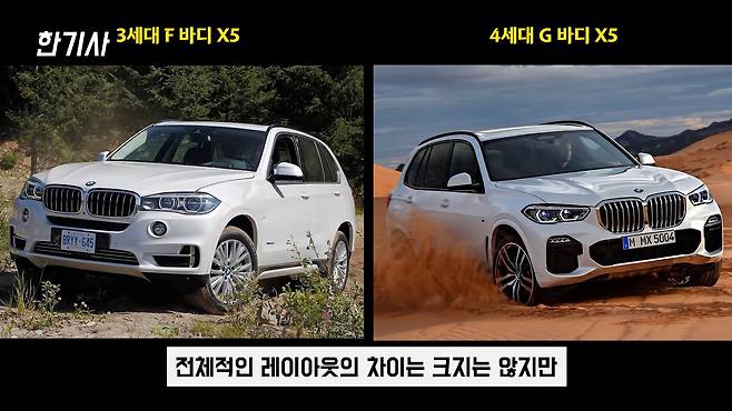 그 다음으로는 이 차의 실내외 디자인이 너무 마음에 드는데 일단 실외 디자인으로는 앞에 전조등에 레이저 라이트가 장착이 돼 있습니다. 웰컴 라이트가 들어올 때 파란색으로 은은하게 불빛이 들어오는 게 가장 아름다운 장점이라고 생각합니다. 전면부 보시게 되면 3세대 F-Body X5에서 4세대 G바디 X5로 넘어오게 되면서 전체적인 레이아웃의 차이는 크지는 않지만 4세대로 오게 되면서 조금 더 각지고 남성다운 이미지로 다듬어진 것 같거든요.