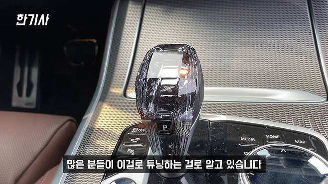 그리고 가운데 있는 BMW의 약간 상징인데 스와로브스키 기어봉입니다. X5의 상징이라고도 할 수 있는데 굉장히 아름다운 것 같습니다. 많은 분들이 이걸로 튜닝하는 걸로 알고 있습니다. 그리고 그 위에 은은하게 들어가 있는 앰비언트 라이트와 냉/온 컵홀더 기능이 들어가 있거든요. 냉기나 열기나 오랜 시간 유지해주는 기능이 저는 마음에 들어서 잘 쓰고 있습니다.