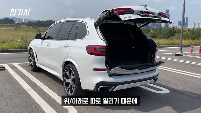 그리고 BMW X5만의 특징인데 트렁크 테일 게이트가 클램쉘 타입으로 위아래로 따로 열리기 때문에 뒷공간이 좁은 우리나라 주차장에서도 뒤를 열 수 있고 무거운 짐을 실을 때도 한번 얹을 수 있는 공간이 있어서 그게 장점이라고 생각합니다. 그리고 와이프와 함께 캠핑을 즐기고 있습니다. 뒷좌석을 다 접었을 때 완전 완벽한 풀플랫은 아니지만 그래도 누웠을 때 불편하지 않은 정도여서 캠핑이나 차박을 즐기기에는 좋은 차 같습니다.