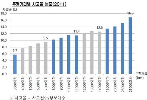 구체적으로 주행거리가 3천㎞ 이하의 경우 사고율이 5.7%였지만, 9천㎞ 초과∼1만㎞ 이하는 11.6%, 1만9천㎞ 초과∼2만㎞ 이하는 14.1%에 달했다.