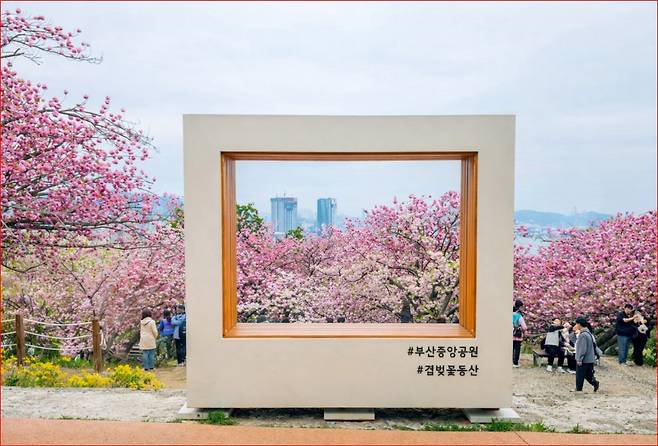 비탈길에 자리 잡은 겹벚꽃 나무들은 그 자체로 훌륭한 배경이 됩니다. 특히 사각 프레임 형태의 포토존에서는 몽글몽글한 핑크 구름과 그 너머로 보이는 부산 바다를 한 번에 담을 수 있어 줄을 서서 기다릴 정도로 인기가 높습니다. 피크닉을 즐기고 싶다면 비탈길보다는 위쪽의 평평한 잔디밭으로 이동해 보세요. 겹벚꽃은 잎과 꽃이 동시에 피어 더욱 생기 넘치는 봄의 에너지를 전해줍니다.