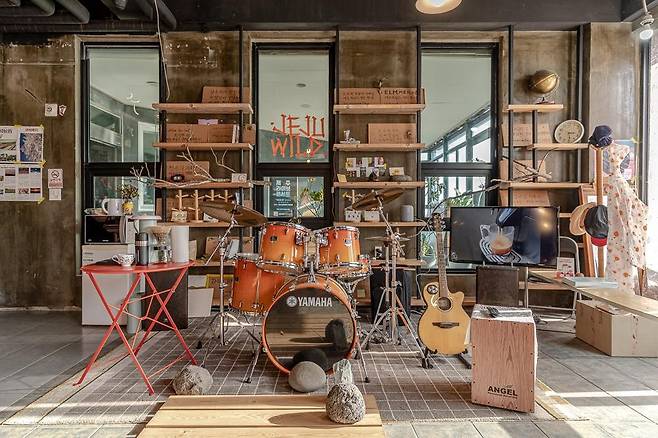 숙소 공간 안에서는 어디서든 넉넉히 와이파이를 쓸 수 있고 악기 연주, 음악감상 등을 할 수 있는 여가 공간이 있으니 취미활동도 마음껏 할 수 있다. 럭셔리한 호텔에서는 누려보기 어려운 자유의 시간이다. 컴퓨터와 종일 씨름하는 디지털 노마드에게는 힐링의 시간을 누리는 곳. 제주워케이션 제주와일드 풍경이다.