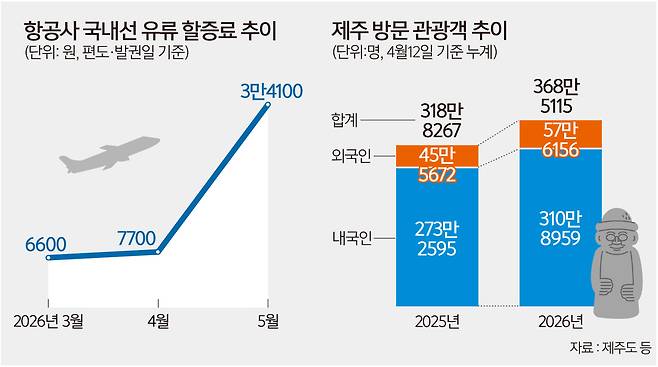 제주도 관계자는 “유류 할증료 인상은 관광객뿐 아니라 병원 방문 등 일상적 이동을 위해 항공기를 이용해야 하는 도민에게도 직접적인 부담으로 작용하고 있다”며 “이미 국회에 제주의 현실을 전달했으며 특별기 증편과 대형기 운용 등 항공 좌석 확보를 위한 노력을 지속할 계획”이라고 밝혔다.