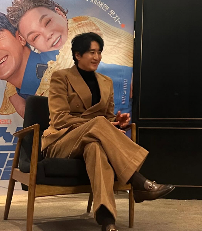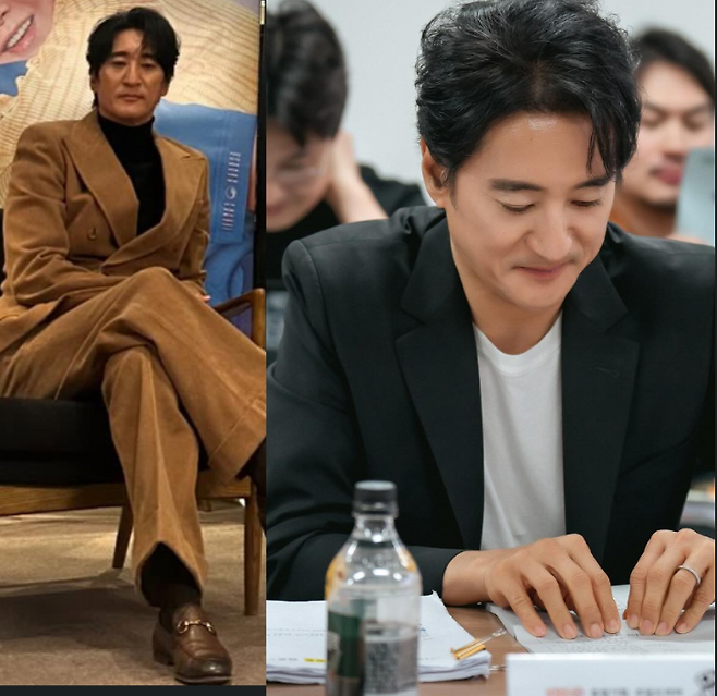 신현준 님은 베이지 정장 셋업으로 따뜻하면서 중후한 멋을 갖춘 패션을 보여줬는데요. 블레이저 안에는 검정색 목티를 매치했더라고요. 신발은 브라운 구두를 착용해서 베이지 수트와 톤온톤으로 자연스러웠죠.