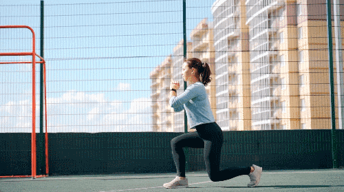 바닥에 서서, 손은 가슴 앞에서 잡습니다. 오른발을 앞으로 크게 내딛고, 무릎을 90도 각도로 구부리며 몸을 내립니다. 왼발을 앞으로 당겨서 같은 방식으로 런지 동작을 이어갑니다.