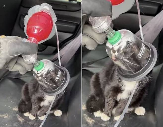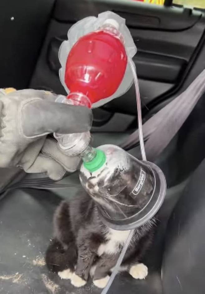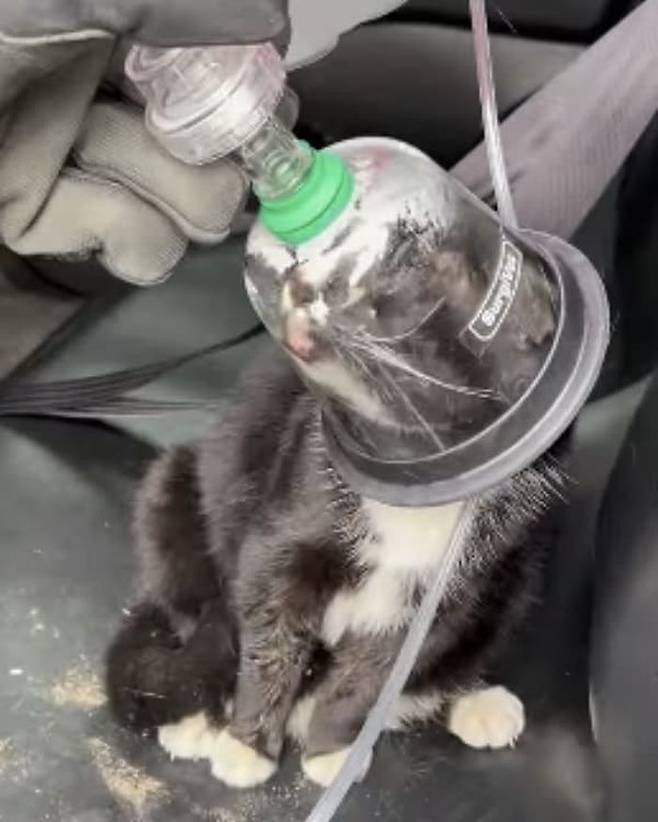 공개된 영상 속에는 소방관이 고양이 전용 산소 마스크를 작은 고양이의 얼굴에 조심스럽게 대고 있는 모습이 담겨 있었습니다.