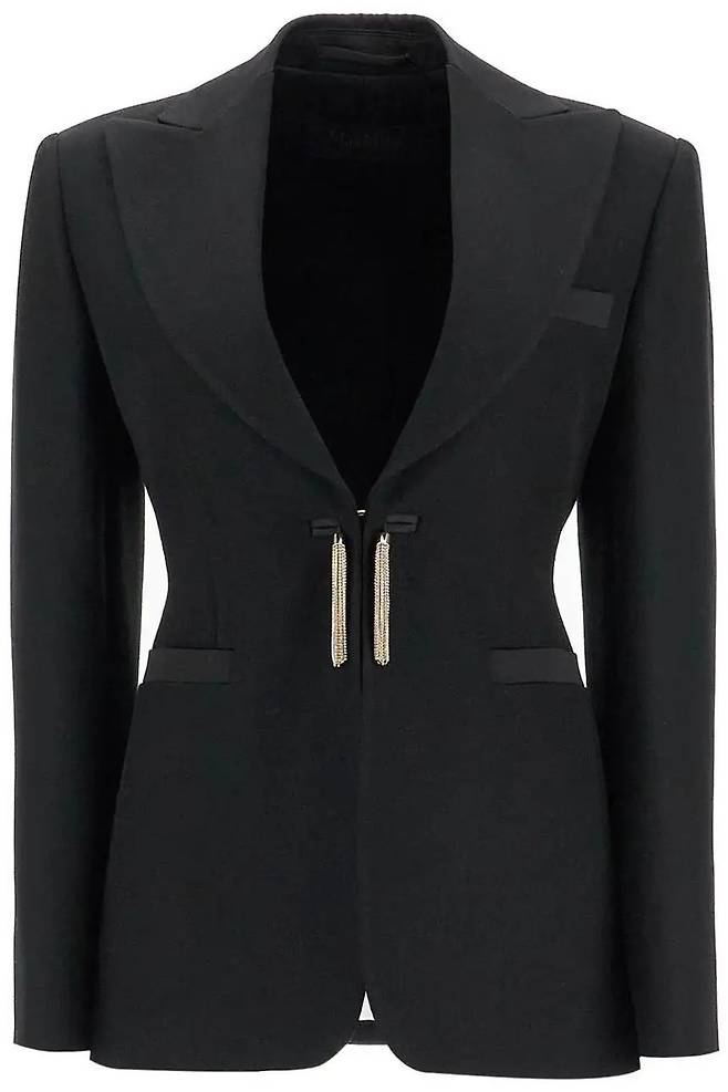 새틴 칼라, 가슴 포켓, 웰트 포켓이 특징인