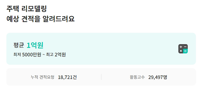 숨고 내에서 거래되는 주택 리모델링 평균 비용은 건당 1억대에요. 최저 비용은 5천만 원 대이고, 최고 비용은 2억대로 책정되어 있어요.