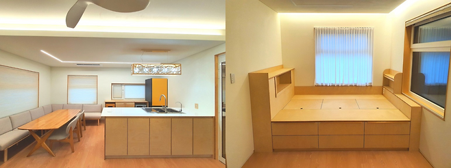 집이 완성되고 동네 어르신들이 구경 오셨어요. 예전 집은 생각도 안 나고, 이런 구조의 집은 처음 봤다고요. 진짜 골조만 남겨두고 집을 거의 새로 지었다고 보면 돼요. 기존 벽을 다 철거하고 공간을 터서 방 1개와 거실 겸 주방을 만들었거든요.