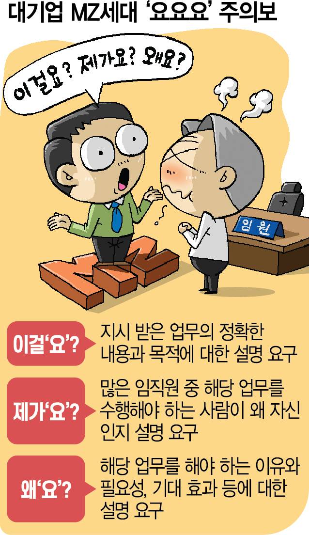 최근 대기업 임원들 사이에서 이른바 MZ세대(1980~2000년대 초반 출생자)의 ‘3요’ 주의보가 확산하고 있다. 상사의 업무 지시에 ‘이걸요?’ ‘제가요?’ ‘왜요?’라고 되묻는 젊은 직원들의 반응을 3종 세트로 묶은 신조어다. 군소리 없이 지시를 따르던 기성세대와 확연히 구분되는 MZ세대의 반발에 각 기업 간부들은 새 기업 문화 조성을 두고 머리를 싸매는 분위기다. 일부 대기업은 아예 사내 임원 교육으로 3요에 적절히 대응하는 방식을 전파하고 나섰다.