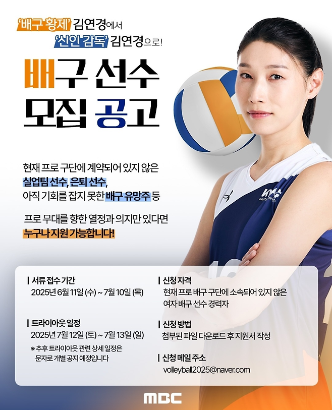 프로 배구단에 소속되지 않은 선수라면 누구든지 신청 가능하며, 김연경과 함께 트라이아웃에 참가하는 기회가 주어집니다. 접수 기간은 2025년 6월 11일부터 7월 10일까지이며, 서류 접수 후 7월 12일부터 이틀간 트라이아웃이 진행될 예정입니다.