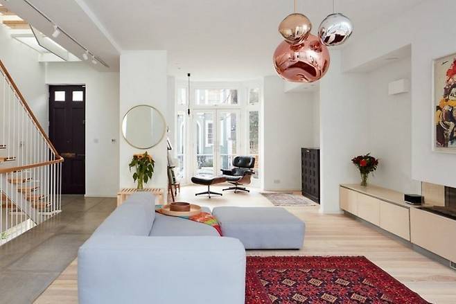 이 런던 주택의 경우 메인 도로 쪽 창가가 아치형으로 튀어나와 있다. 이 특성을 살려 메인 거실과 아치 공간 사이 벽을 만들어 공간을 분리하는 대신 공간의 기능에 맞는 가구 배치만으로 공간을 분리한 사례다.