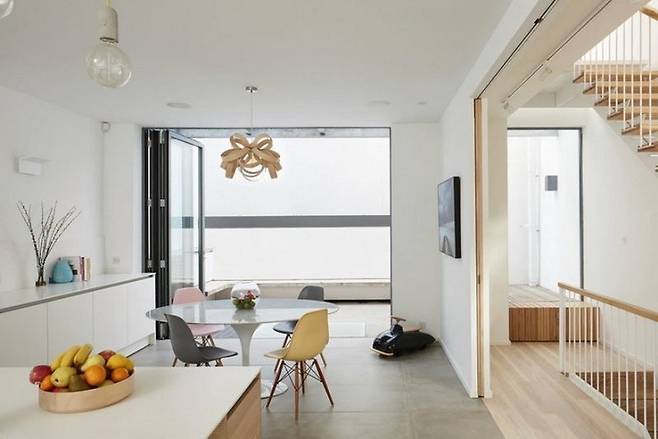 벽 속에 문을 숨기는 슬라이딩 도어를 설치해 평상시는 개방해 사용하고 필요하면 계단 공간과 다이닝 공간을 분리할 수 있도록 설계했다.