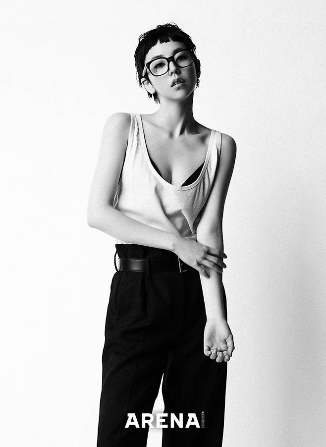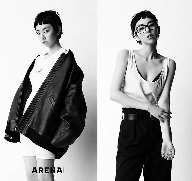 안소희는 패션매거진 <아레나 옴므 플러스> 화보에서 커트 머리에 블랙앤화이트 컬러의 구조적인 미니멀룩으로 보이시한 매력을 발산했다.