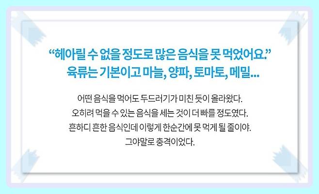 음식을 잘못 먹어 두드러기가 생기면 피부 팽진은 물론, 심한 경우 기도까지 부풀어 올라 호흡곤란을 일으킬 수도 있습니다. 단순히 피부에만 문제가 생기는 것이 아니라, 초기에 적절히 대처하지 못하면 사망에까지 이를 수 있습니다.