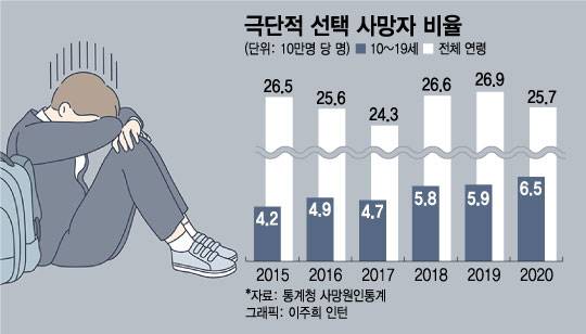 통계청에 따르면 전체 인구 대비 극단적 선택으로 사망한 사람의 비율은 10대에서 증가 추세에 있다. 2015년 극단적 선택을 한 사망자 수는 인구 10만명당 4.2명(이하 10만명당)이었던 반면 2020년 6.5명으로 늘었다. 2016년 4.9명에서 2017년 4.7명으로 소폭 감소했던 것을 제외하면 해마다 늘고 있다.
