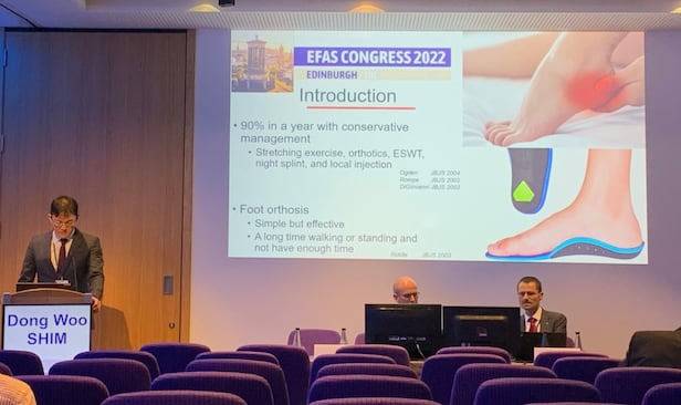 “난치성 족저근막염 환자 28명을 대상으로 전접촉 안창과 3 스파이크 안창을 무작위로 배분해 6개월 간 착용하게 했습니다. 이후 환자의 통증, 기능회복, 삶의 질 평가를 시행했는데요. 두 안창을 착용한 모든 환자들이 약 5.2주후 임상적으로 증상이 호전됐습니다. 통증 척도를 통한 비열등성(치료 효능이 나쁘지 않은 성질) 평가에서 두 집단의 차이는 없었어요. 다만, 3 스파이크 안창을 착용한 집단에서 기능적 회복이 더 빨리 발현됐습니다. 3 스파이크 안창이 전접촉 방식보다 굽힘 모멘트가 더 커서, 족저근막에 대한 자극 효과가 더 커서 나타난 결과로 풀이합니다.”