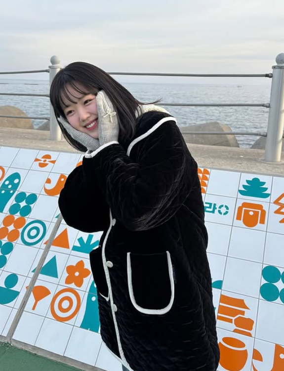 이번에 지예은 님의 일상룩을 준비해 봤어요. 블랙 컬러의 귀여운 미디 코트를 착용한 모습이었는데요. 벨벳 소재로 고급지면서 오버핏으로 러블리한 무드가 느껴지더라구요.
