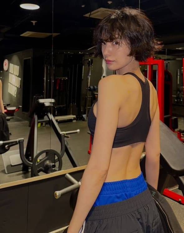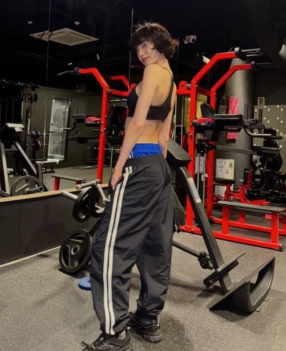 상의로는 심플한 스포츠 브라탑을 매치해 시크한 스포티 무드를 완성했는데요. 나나처럼 다른 컬러의 팬츠를 착용하여 컬러를 대비시키면 한층 스타일리시해 보입니다.