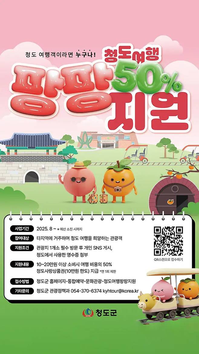 여행 경비의 절반을 지역 화폐로 환급해주는 ‘청도 여행팡팡 지원사업’은 단순한 관광 혜택을 넘어, 알차고 전략적인 여행을 가능케 하는 새로운 방식의 지역 관광 지원이다.