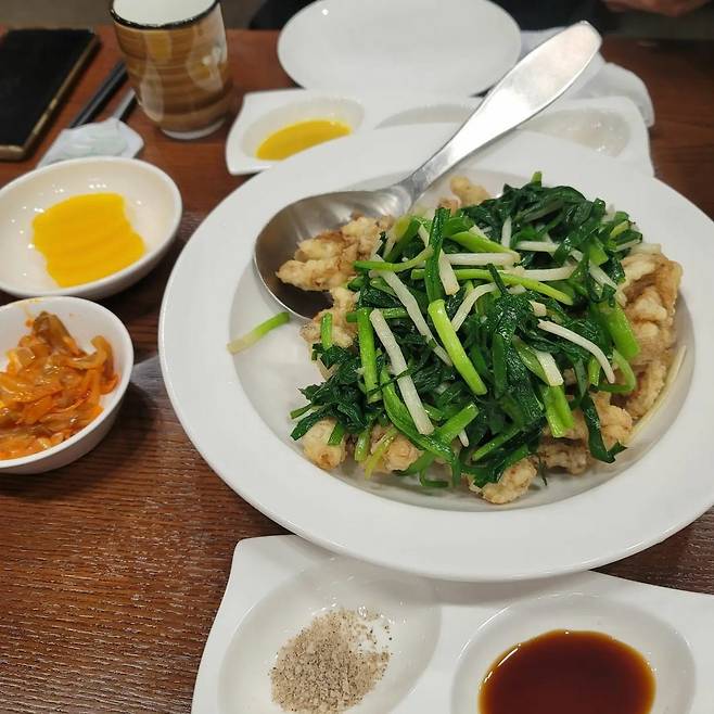 ▲메뉴: 부추복어살(대) 45,000원 / 류산슬(대) 45,000원
