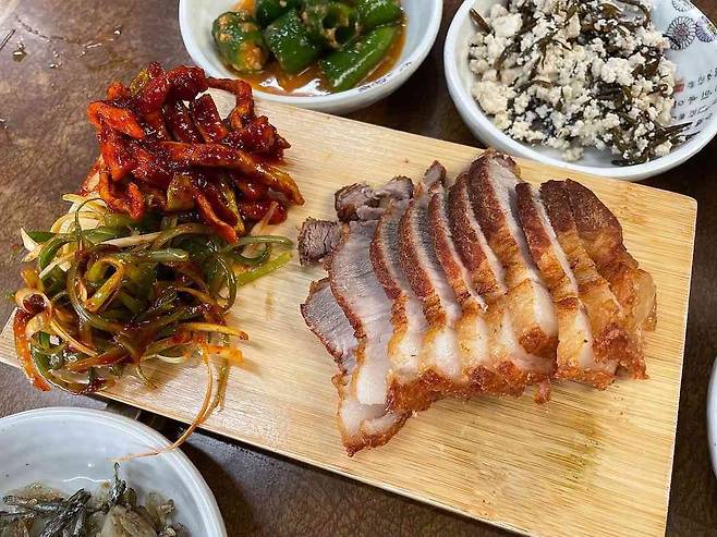 푸짐한 한상차림으로 도민이 추천하는 식당 안덕 '화순한가네식당'. 튀김 돔베 고기 정식이 대표 메뉴로 수육이나 보쌈처럼 촉촉한 돔베 고기를 살짝 튀겨내 만든 것이 특징이다. 정식을 주문하면 함께 나오는 밑반찬은 매일 조금씩 달라지지만 밥과 국, 7가지가 넘는 반찬과 양념게장, 쌈 채소까지 돔베 고기와 함께 곁들일 수 있는 반찬들이 푸짐하게 나온다. 전체적으로 슴슴하고 담백하기 때문에 집에서 먹는 집 밥 같은 밥을 든든하게 먹을 수 있다.