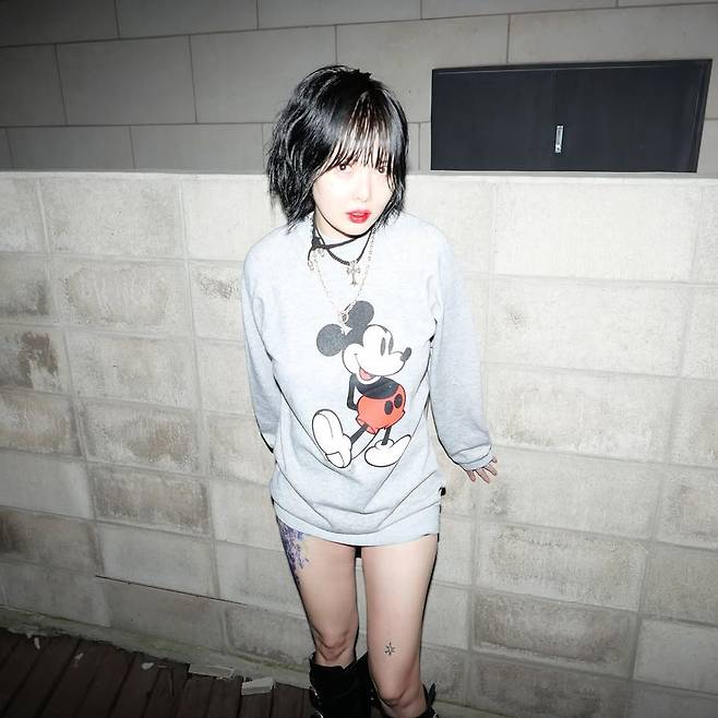 #현아 #현아패션 #현아스웨트셔츠 #미키마우스티셔츠 #스트릿패션 #체인레이어링 #Y2K룩 #레드립포인트 #캐주얼코디 #스타패션 #그래픽티셔츠 #개성있는룩