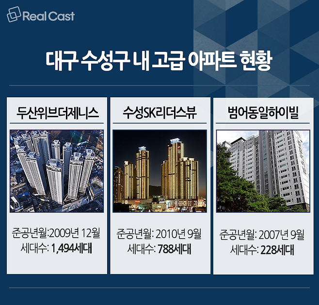 따라서 위와 같은 고급 아파트에 거주하고 있는 대구 자산가들은 아파트가 점차 노후화되자 새 아파트에 대한 니즈가 증가하고 있는 상황입니다. 하지만 수성구에 공급되는 대형 평형이 희소하고, 투기과열지구 및 조정대상지역으로 묶여있던 수성구에서 주택을 보유하고 있는 자산가들이 청약으로 신규 아파트를 분양 받는다는 것은 사실상 불가능한 일이었습니다.