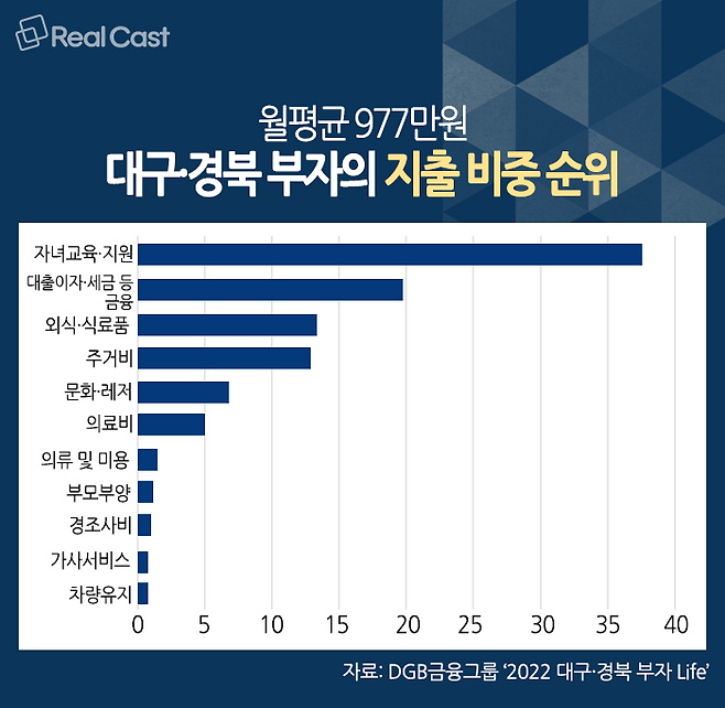 그렇다면 대구·경북 부자들의 라이프 스타일은 어떨까요? 이들은 월평균 977만원을 지출하는 것으로 나타났습니다. 대구·경북 부자들의 지출에서 가장 큰 비중을 차지한 것은 ‘자녀 교육(37.5%)인데요. 특히 초중고 자녀를 둔 40대 부자의 51.7%가 지출에서 자녀교육이 가장 큰 것으로 응답했습니다.