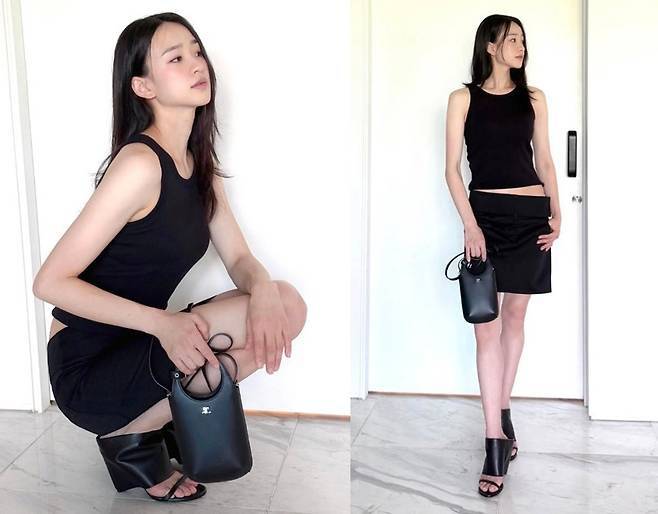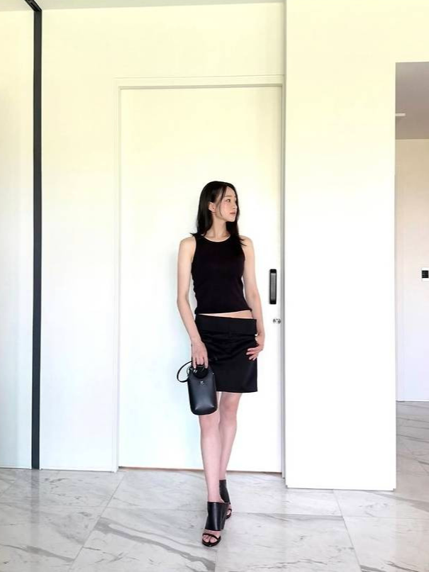 군더더기 없는 블랙 슬리브리스 탑과 사이드 컷 디테일이 돋보이는 미니 스커트를 매치해 미니멀하면서도 감각적인 룩을 완성했습니다