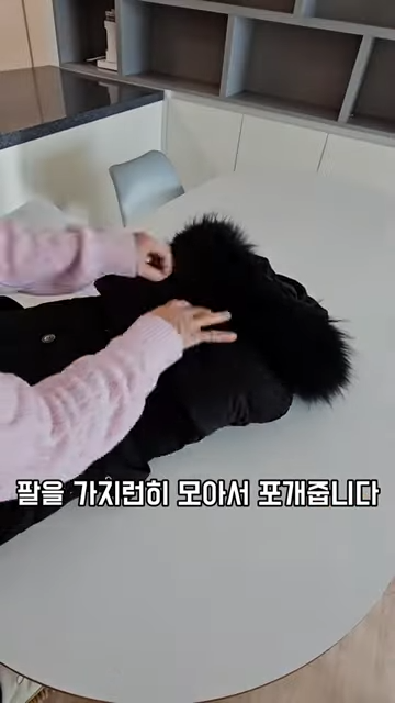 두 번째 패딩을 접어서 보관할 때는 먼저 지퍼를 잠가 준 뒤 팔을 가지런히 모아서 포기해 줍니다 패딩 아래쪽을 들어 올려 주고 윗부분을 넣어 주면 깔끔하게 접어서 보관할 수 있어요.
