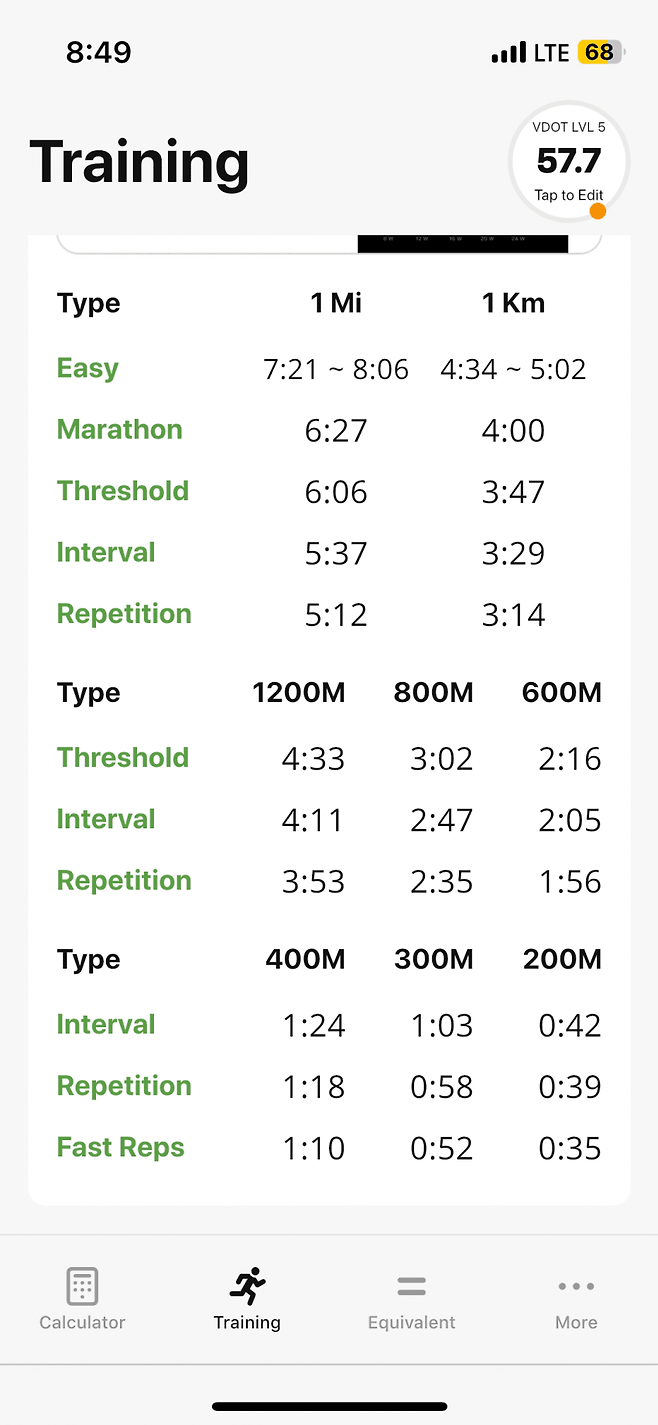 vdot 기준 800m 인터벌 페이스인
