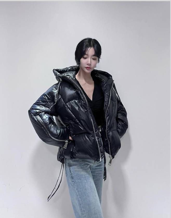 클라라는 광택감 있는 오버핏 블랙 패딩을 선택해 트렌디한 감각을 더했으며, 안에는 깊은 브이넥 탑을 매치해 세련된 분위기를 극대화했습니다.