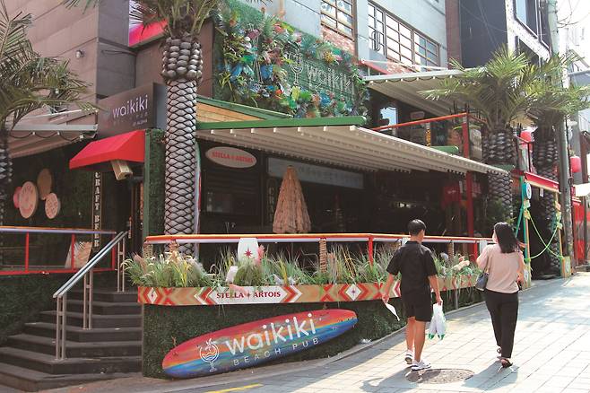 코로나19 대유행으로 타격을 받긴 했지만 세계음식거리에는 예쁘고 독특한 카페와 루프톱(옥상)을 비롯해 음식점, 술집 등이 남아 있습니다. 일본 온천 거리에서 마주할 법한 식당도 다양한 나라의 국기가 달린 맥줏집도 벽면을 초록색 술병으로 가득 메운 이색적인 풍경의 음식점도 여전합니다.