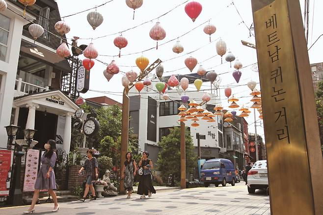 약 300m 길이의 퀴논길은 우리나라에 세워진 첫 베트남 타운인 셈입니다. 서울 용산구와 베트남 퀴논시가 자매결연(1997) 20주년 기념사업으로 2016년에 조성한 거리입니다. 또한 비슷한 시기에 퀴논시 안푸팅 신도시 개발지구 중심가에도 ‘용산거리’가 조성됐다고 합니다.