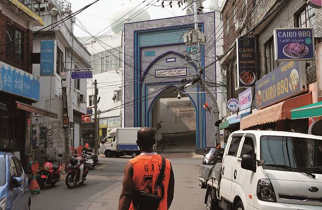 이태원소방서 골목길을 올라 보광초등학교 앞까지 간 다음 샛길로 들어서자 건물들 위로 하얀 첨탑과 돔형지붕이 솟아 있는 게 보입니다. ‘한국이슬람교 서울중앙성원’입니다. 1976년 5월 21일 개원한 우리나라 최초이자 최대의 이슬람 사원입니다. 아랍어와 한글, 영어가 병기된 간판과 톡 쏘는 향신료 냄새가 눈과 코를 자극합니다. 길가엔 할랄 음식점, 차도르와 히잡을 진열한 잡화점 등이 늘어서 있습니다. 이 길의 공식 명칭은 우사단로10길입니다. 사람들은 흔히 ‘이슬람 거리’ 또는 ‘우사단길’이라고 부릅니다.