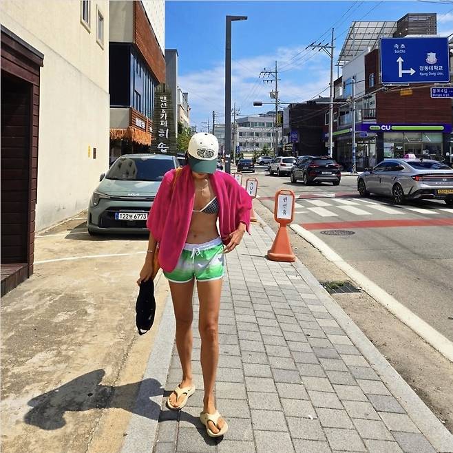 또한 화이트·그린 배색 볼캡과 슬리퍼를 더해 편안하면서도 트렌디한 무드를 살렸고, 군살 없는 탄탄한 복근과 건강미 넘치는 몸매가 돋보였습니다.
