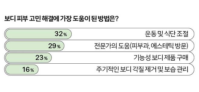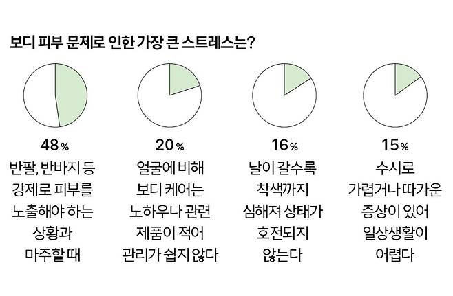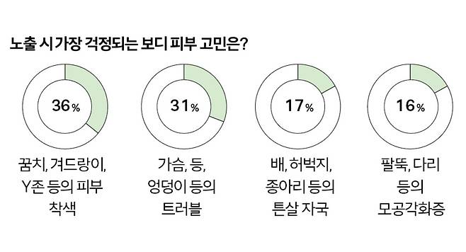 민소매, 크롭 톱, 쇼츠와 같이 노출이 심한 옷으로 자꾸만 손이 가는 여름. 그런데 잠깐! 본격 노출에 앞서 지금 내 몸 사각지대는 확인했는가? 울긋불긋한 여드름이 솟아오른 가슴과 등, 거뭇거뭇한 팔꿈치, 옆구리에 볼록하게 튀어나온 러브핸들까지. 1년 내내 방치했던 몸을 자세히 살펴보니 문제가 한둘이 아니다. 이와 관련해 코스모 독자들의 리얼 의견도 들어봤다. 역시나 가장 큰 보디 고민은 꿈치, 겨드랑이, Y존 등 거뭇거뭇하게 착색된 흔적들. 그다음은 가슴이나 등, 엉덩이에 난 트러블과 자국으로 인한 스트레스가 심하다 답했다. 이뿐이겠는가? 여름이 오면 가장 두려운 것은 역시나 팔뚝, 허벅지 할 것 없이 축 늘어진 지방이라 답했고, 위와 같은 고민들로 노출이 심한 옷을 입기 꺼려진다는 응답자가 48%에 달했다. 갑자기 들이닥친 수많은 보디 문제들. 어디서부터 어떻게 관리해야 할지 도무지 감이 오지 않는가? 그렇다면 코스모가 알려주는 여름 보디 계획표를 눈여겨보길. 전문가 없이도 보디 피부 고민 해결은 물론 군살 및 라인까지 관리할 수 있는 꿀팁들만 나열했다.