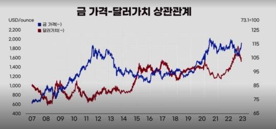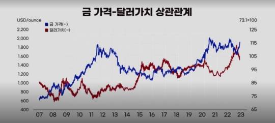 역사적으로 봤을 때 금 가격은 달러가치와 실질금리에 반대로 움직이는 경향이 있는데, 미국 연준의 금리인상 기조가 막을 내릴 것이란 시장 기대감이 달러 가치 하락, 실질 금리 하락 예상으로 이어지면서 금 가격 상승 베팅의 판을 키우고 있는 것이다.