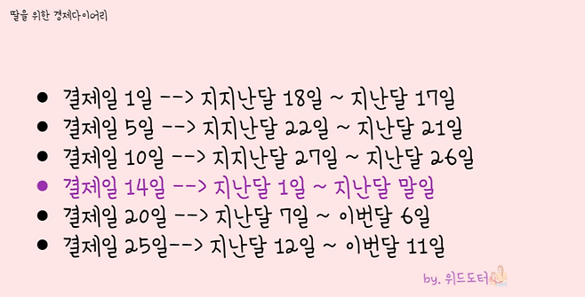 이 기준도 전월 1일 ~ 30일까지 계산하는 경우가 많죠. 결제일을 14일로 해두면 계산이 쉬워서 놓치지 않고 챙길 수가 있답니다.