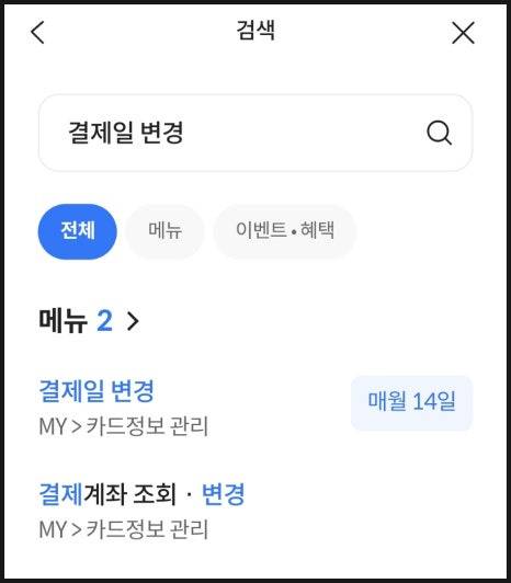 현대카드 앱을 열어서 검색란에 결제일 변경을 검색해주세요.