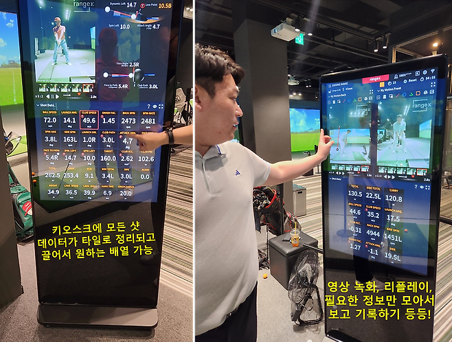 가장 쉽게 설명하는 방법은, 키오스크 자체가 커다란 터치 스마트폰이라고 보는 게 빠릅니다. 나의 모든 스윙 영상을 핸드폰 사용하듯이 느리게/빠르게 보고, 돌리고, 저장 가능합니다. 또한, 골프샷 분석 프로그램처럼 영상 위에 줄 긋고 표시하고 레슨 하기 편하답니다. 마지막으로, 앞서 말한 타사 론치 모니터보다 실제로 더 많은 샷 데이터를 제공하지만, 핸드폰의 앱들을 손가락으로 드래그해서 정리하듯 필요한 정보만 골라서 나열하니 매우 직관적이고 간편했습니다.